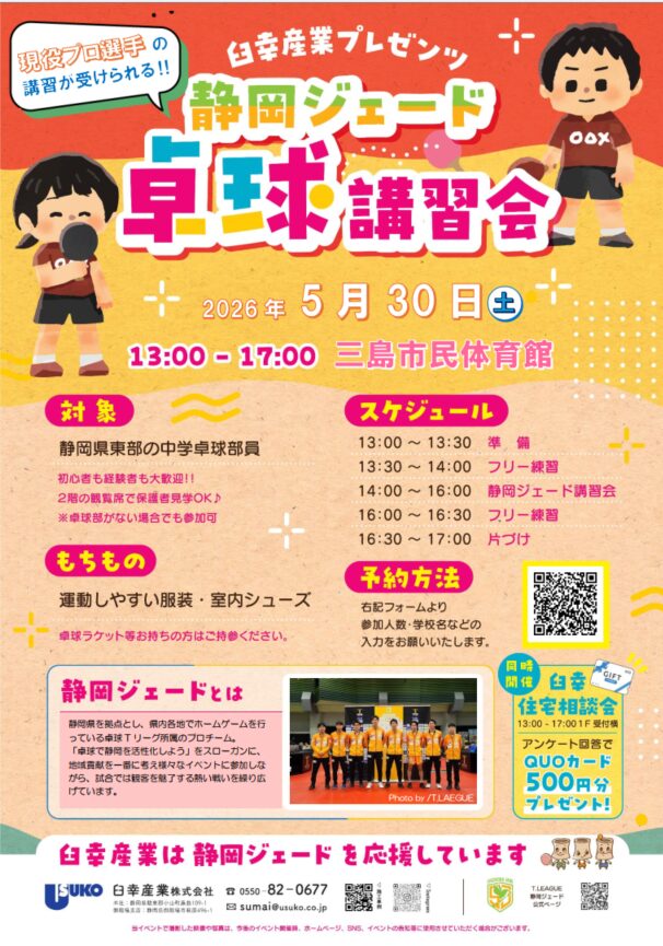 このたび臼幸産業株式会社では、静岡ジェード所属のプロ卓球選手を講師にお迎えし、 卓球講習会を開催いたします。本講習会は、他の参加者の皆様とのフリータイムでの試合交流に加え、